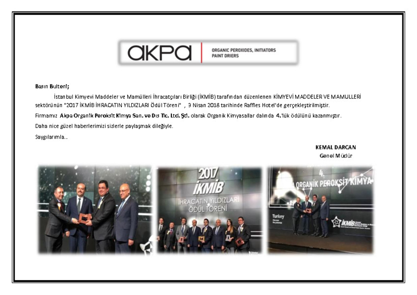 İstanbul Kimyevi Maddeler ve Mamuller İhracatçıları Birliğinde Türkiye'nin en iyi 4. ihracat yapan firması olan Akpa Kimya Ambalaj San. ve Tic. A.Ş.'ni tebrik ediyor ve başarılarının devamını diliyoruz.